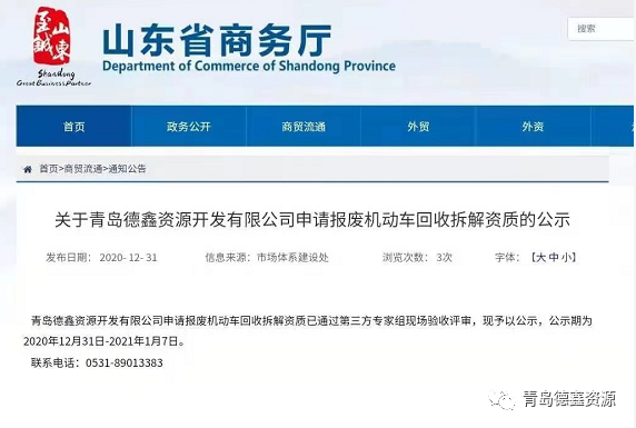 于2021年1月19日由山東省商務廳頒發報廢機動車回收拆解企業資質認定證書。